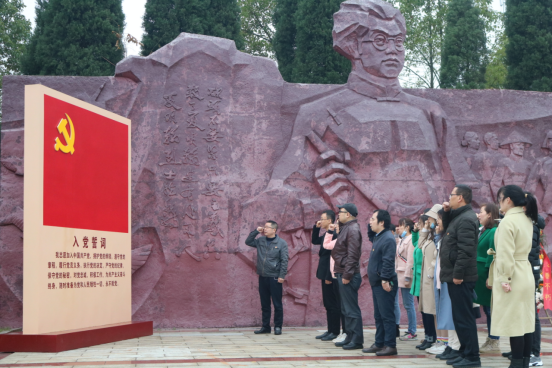 来到夏明翰广场浮雕前,大家面对党旗列队肃立,在化学与环境工程学院党委书记周立带领下重温入党誓词,感悟初心使命。