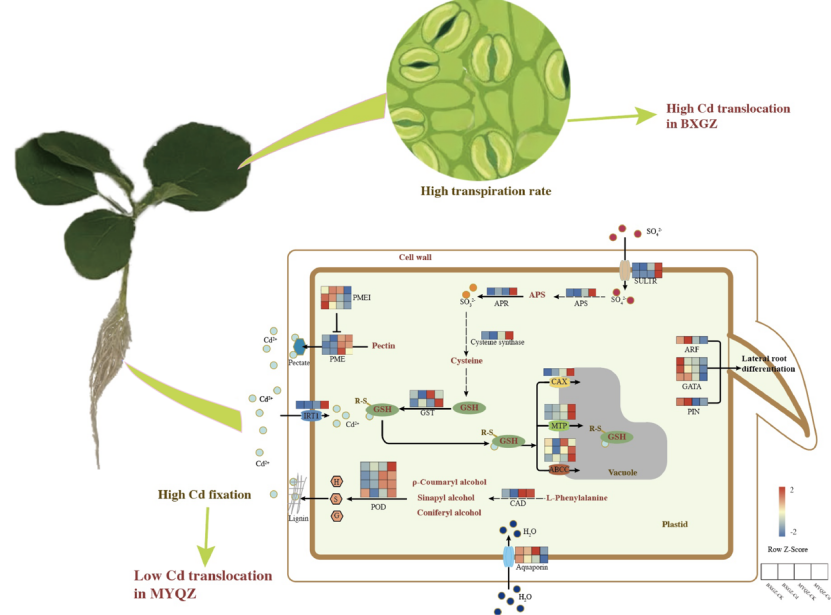 近日,我院申创博士在《Frontiers in Plant Science》(中科院二区)发表了题为“Characterization of cadmium accumulation mechanism between eggplant (Solanum melongena L.) cultivars”的研究论文。茄子是一种容易积累镉的蔬菜,即使种植在轻度镉污染的土壤中也可能导致果实镉含量超标。植物根细胞壁组分在镉的吸附固定过程中起重要作用,根系发达程度以及蒸腾强度对植物吸收转运镉的能力有显著影响。本文从影响茄子镉吸收和转运过程的因素着手,揭示了茄子品种间镉积累能力差异的生理和分子机理。研究发现,茄子低镉品种可通过提高根细胞壁组分(果胶和木质素)含量来增强吸附镉的能力(图1)以及促进位于根液泡膜上转运蛋白基因的表达(图2)来提高区隔化镉的能力,从而阻止镉向茎叶转运,降低果实镉含量。而高镉品种可通过促进根系发育以及增强蒸腾作用(图2)来提高镉的吸收和转运,进而导致果实镉含量高。