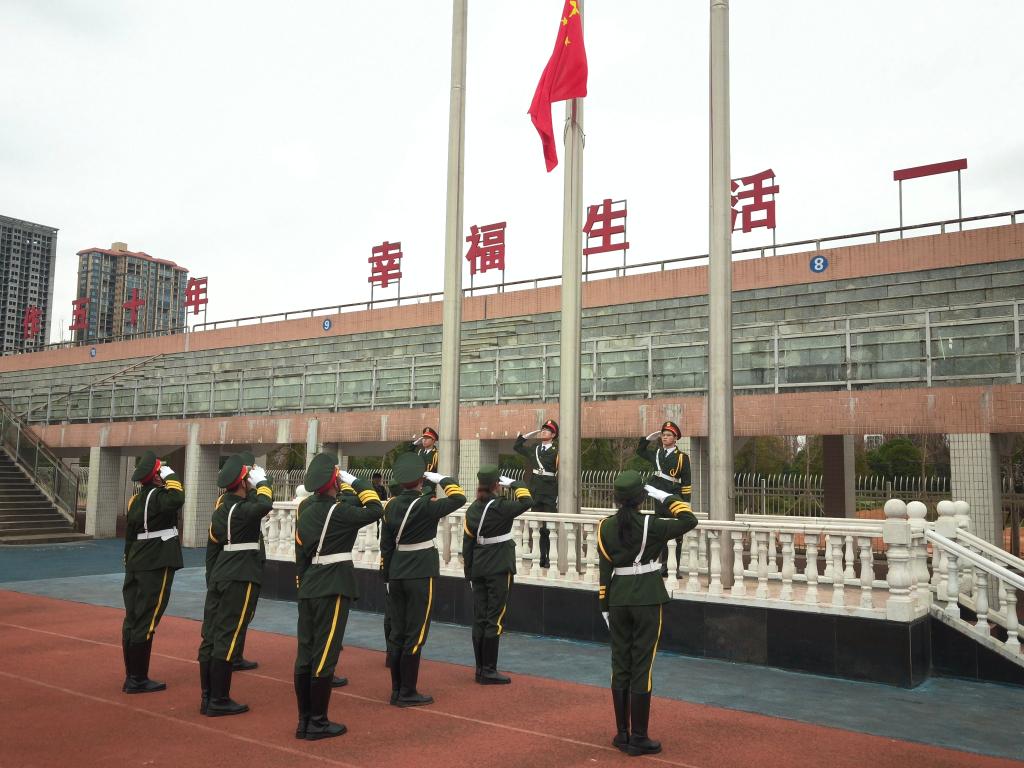 在激昂的国歌声中,国旗护卫队步伐铿锵,五星红旗冉冉升起。全体师生肃立注目,胸腔中激荡着对祖国的无限赤诚与对雷锋精神的深切共鸣。