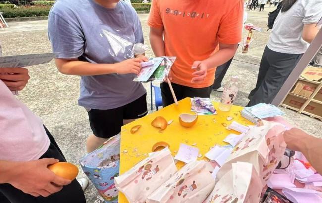 活动现场精心设置了互动游戏环节,其中最引人注目的"神秘金蛋"吸引了学院领导班子成员前来参与。这些承载着心理知识的盲盒装置,内藏精心设计的心理测试题、趣味挑战卡与创意奖惩券。当同学们轻轻敲开金蛋的瞬间,一场充满未知与惊喜的心理探索之旅就此开启通过知识问答、趣味闯关等盲盒任务,让心理学原理在欢声笑语中悄然浸润心田。