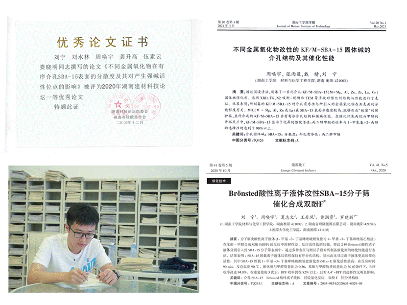 在大二下学期,在担任疫情防控志愿者的同时,主动进入刘宁老师课题组,通过查阅大量文献,他尝试将两种Brönsted酸性离子液体分别引入到SBA-15分子筛表面,从而解决酸性离子液体在苯酚-甲醛合成双酚F(BPF)的反应中溶解性差、反应活性低的问题的问题。相关成果于2020年10月在《能源化工》发表论文《Brönsted酸性离子液体改性SBA-15分子筛催化合成双酚F》。大三期间,他在老师的指导下研究不同金属氧化物在SBA-15表面分散度对其性能的影响,其相关研究成果《不同金属氧化物在SBA-15表面分散度对其性能的影响》于2021年1月发表在中文核心期刊《化学工程》,,其相关研究成果获得“2020年湖南建材科技论文论坛一等优秀论文”。