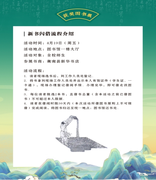 为迎接“4.23世界读书日”来临,倡导并组织开展阅读推广工作,不断创新阅读推广方式,加强图书馆文献资源建设,激发师生读者的阅读热情,实现读者与图书之间零距离,图书馆联合衡南县新华书店举办“文津图书奖”主题书展及新书闪借活动。