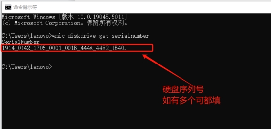 1. 硬盘序列号:输入cmd运行命令界面,输入命令: wmic diskdrive get serialnumber ,如图;