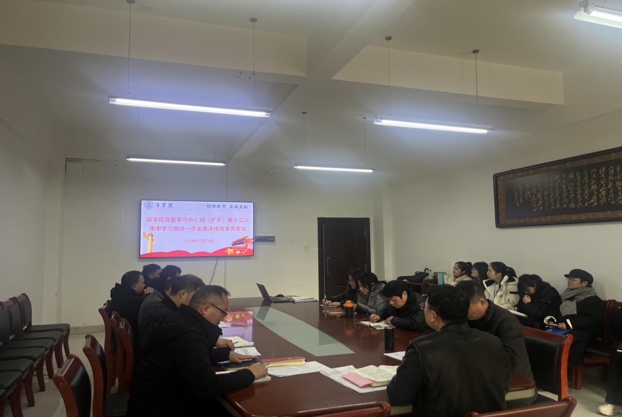 12月24日上午,商学院于经315会议室召开党委学习中心组(扩大)第十二次集中学习暨进一步全面深化改革务虚会,学院全体党委委员、中层以上干部、辅导员参会。会议由学院党委书记王小兵教授主持。
