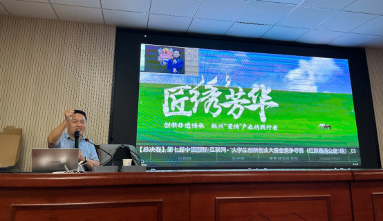 王中伟老师以乡村振兴产品、社会工作服务、非遗传承产品三种不同类型的青红赛道案例为引入,给在座的师生们上了一堂生动的指导课。他指出,项目要立足国家政策,要有家国情怀,能精准把握社会痛点,从实际出发,做到可落地、可操作、可推广。最后,他与现场的师生一起交流,面对面解决同学们在项目打磨中遇到的问题。