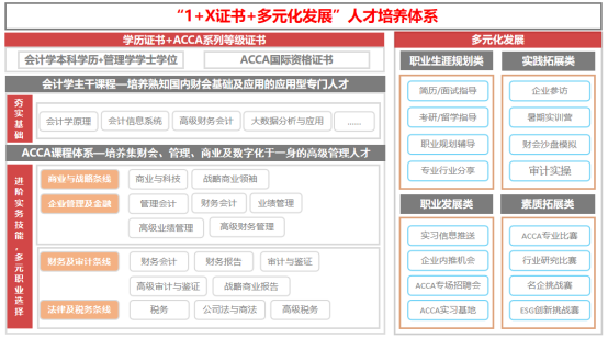 best365中国官方网站会计学ACCA方向班在保留会计学专业主干课程基础上,将ACCA课程与会计学专业部分课程进行了有效替换和补充,并为会计学ACCA方向班单独设置了贯穿大学四年全程的丰富多元化发展的学习实践活动,形成了特色鲜明的“1+X证书+多元化发展”人才培养体系。