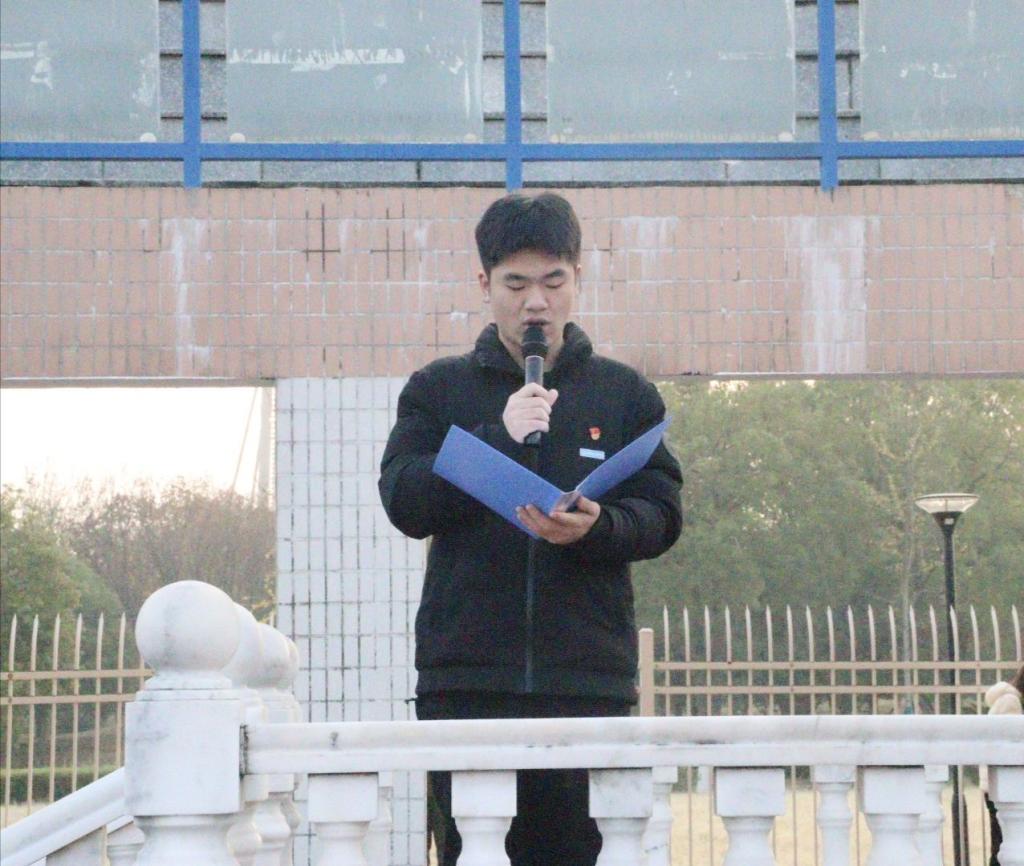 学生代表数管2302班郑齐成进行《国旗飘扬迎华诞,青春担当赴征程》主题发言。他结合自身学习和成长经历发出倡议:“让我们将个人理想融入学校发展与国家需要的洪流,用奋斗与实绩,为学校的高质量发展书写属于我们这一代的崭新篇章!”