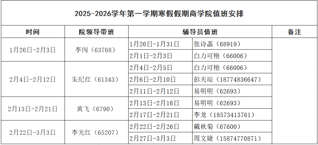 2025-2026学年第一学期寒假假期商学院值班安排