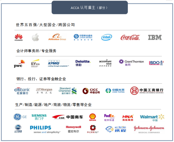 ACCA在全球拥有超过7571家认可雇主,国内认可雇主超过500家。这些雇主对ACCA的课程体系、考试大纲和专业程度给予高度认可,将优先ACCA的学员和会员提供实习、就业和岗位晋升的机会,并支持员工考取ACCA专业资格,大部分雇主还可全额报销考试费用。