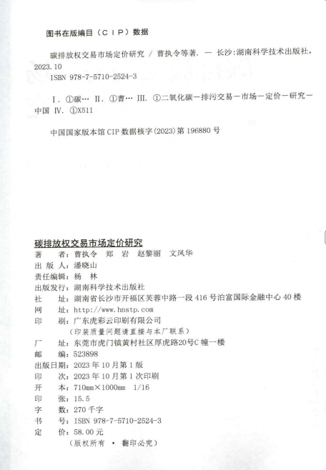 近日,工商管理学省级应用特色学科学科带头人曹执令教授牵头撰写的学术专著《碳排放权交易市场定价研究》由湖南科学技术出版社正式出版。全书分八章,27万字,主要包括绪论、相关理论基础、欧盟碳排放交易市场:碳排放权价格影响因素研究、欧盟碳排放交易市场:碳排放权收益率影响因素研究、中国碳排放交易市场:碳排放权影响因素研究、中国碳排放交易市场间溢出效应研究、中国碳排放交易市场与股票市场间溢出效应研究、研究结论与展望。
