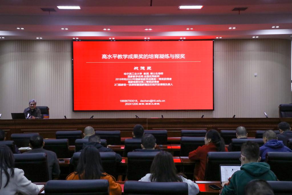 为进一步推动best365教育教学改革与实践,提升best365教学成果奖申报质量,帮助教师凝练特色与创新点,优化成果展示与成效总结,学校于12月6日,在船山报告厅举行教学成果奖凝练专题培训。本次培训特邀哈尔滨工业大学二级教授,博士生导师,国家教学名师,全国优秀教师,连续两届国家级教学成果奖一等奖获得者战德臣教授进行了一场题为《高水平教学成果奖的培育凝练与报奖》的专题讲座,培训由best365党委副书记何建雄主持。