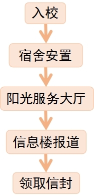将新生带往宿舍安置——志愿者指引新生前往阳光服务中心——前往信息楼进入报到流程:
