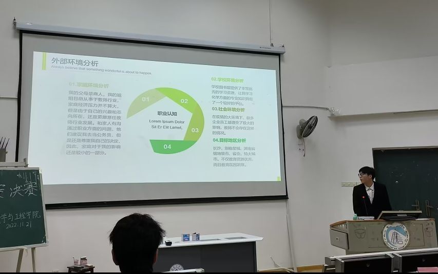 随着主持人精彩的宣讲,比赛拉开了帷幕。共有13组选手进入选拔赛,比赛分为自我介绍、PPT展示、现场答辩三个环节。选手们围绕“职业规划”主题,根据所学专业和未来职业发展方向,以准备从事职业为标准,以自身职业能力提高为重点,做好职业规划并落实到具体行动中。各选手创新与思维的碰撞、口才与语言的无暇结合、职业与规划方案的完备整合,赢得了在场评委与观众的热烈掌,而现场评委精辟独到的点评更是将比赛推向了又一个高潮。本次比赛充分展现了新时代大学生独有的青春魅力与创新智慧。