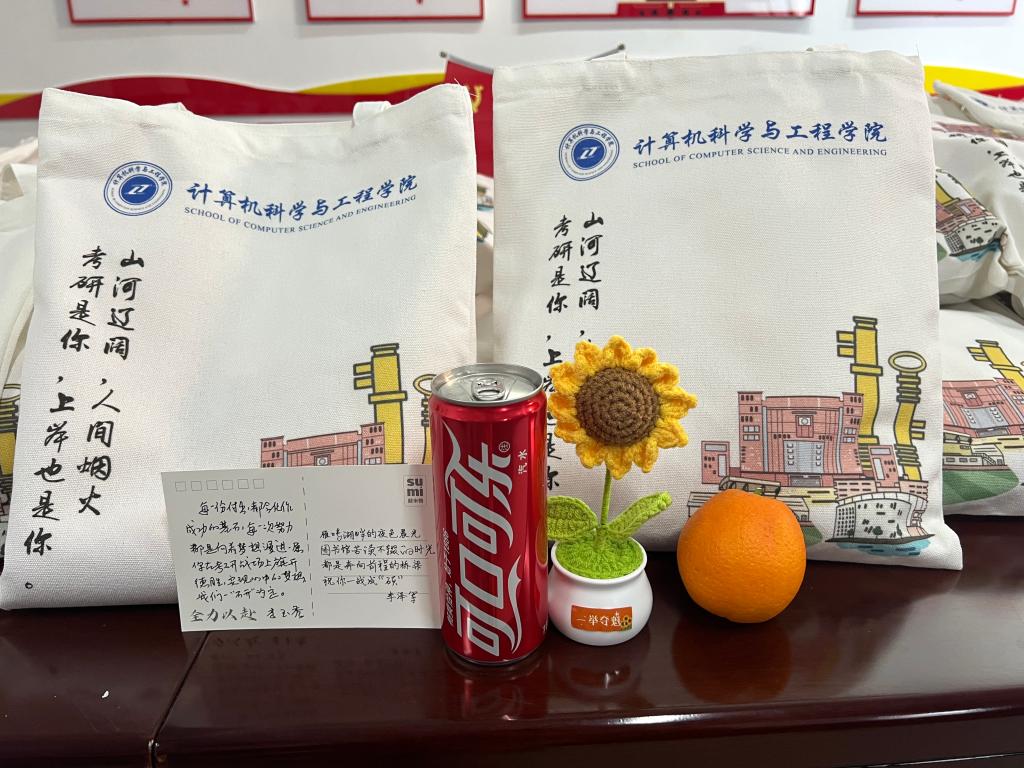 2025届研究生招生考试在即,为坚定考研学子信心,表达学院关怀,计算机科学与工程学院于12月19日下午在图书馆大厅为2025届考研学子发放暖心礼包。学院院长陈敏、党委副书记黄馨仪、副院长戴成秋、全体辅导员以及我院160余名考研学生参加了此次活动。礼包内贴心准备了脐橙、定制可乐、向日葵摆件、学院领导及毕业班辅导员手写寄语的专属贺卡。其中,脐橙寓意“脐”开得胜,心想事“橙”;定制可乐上的“成功上岸 一研为定”、向日葵摆件的一举夺“葵”、院领导手写贺卡等都饱含着学院对考研学子的殷切祝福,让大家在寒冬里感受到温暖。院领导及老师们在现场亲自为同学们发放礼包,并提醒大家在最后冲刺阶段要保持良好心态,以饱满的热情和冷静的头脑迎接考验。
