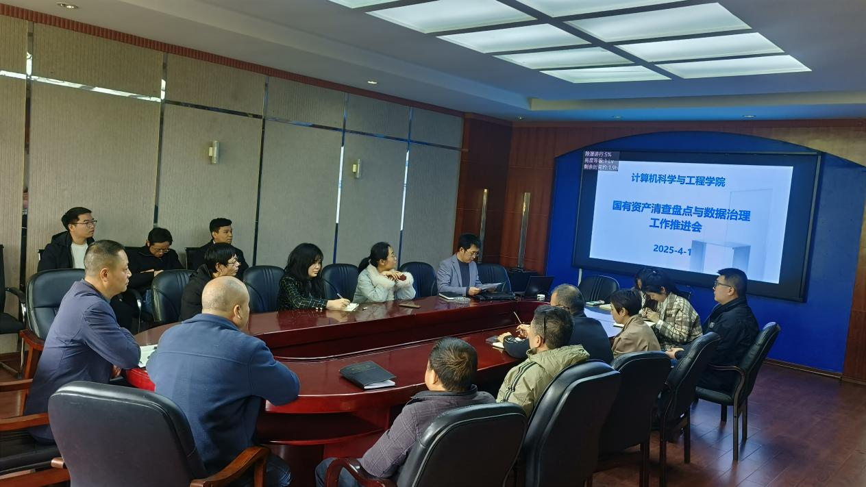 为扎实推进国有资产精细化管理,夯实学院高质量发展基础,2025年4月1日下午,计算机科学与工程学院在信息楼小会议室召开国有资产清查盘点与数据治理工作专项推进会。会议由副院长戴成秋主持,院党委书记叶正明、院长陈敏,领导小组及工作小组成员,各教研室、实验中心、三办主任及资产清查工作相关人员参加会议。