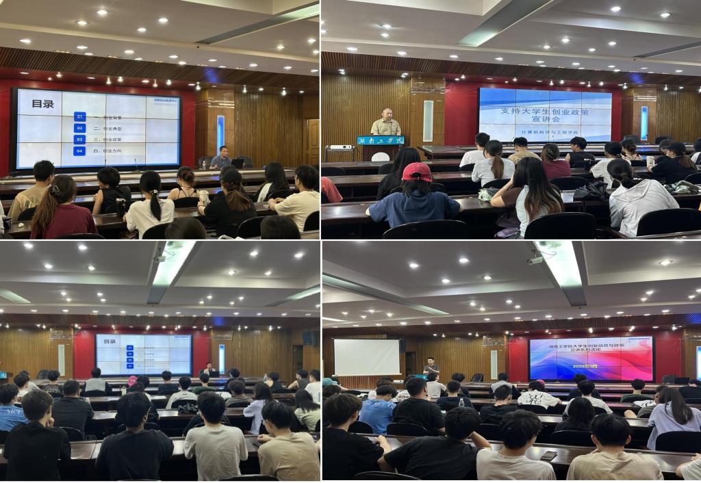 为深入贯彻落实湖南省大学生创新创业“七个一”行动的决策部署,推动大学生创新创业,计算机科学与工程学院于2025年5月正式启动“支持大学生创业政策宣传月”系列活动,活动精心策划了多场专题宣讲会,旨在实现政策宣讲“全覆盖、无遗漏”的目标。学院领导分别担纲主讲,结合学院学科特色与学生实际需求,深入解读创业政策内涵。