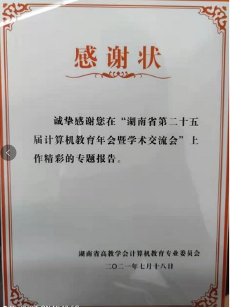 2021年7月18日,由湖南省高教学会计算机教育专业委员会主办,湘南学院承办的湖南省第25届计算机教育年会暨学术交流会在郴州召开,best365计算机基础教研室主任戴成秋应邀参加了本次年会并作了课程教学分享报告。