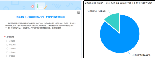 在考试成绩出来以后,从无记名问卷星问卷调查结果来看,课程目标的达成情况总体较好,从考试考核改革的认可度来说,86.4%的同学认可并会选择机考,仅仅13.6%的同学选择笔试试卷考试。为延续同学们的学习热情,寒假算法基础专题练习也已开展了3次,并一周一赛,将为优秀的同学提供更好更多的学习机会。