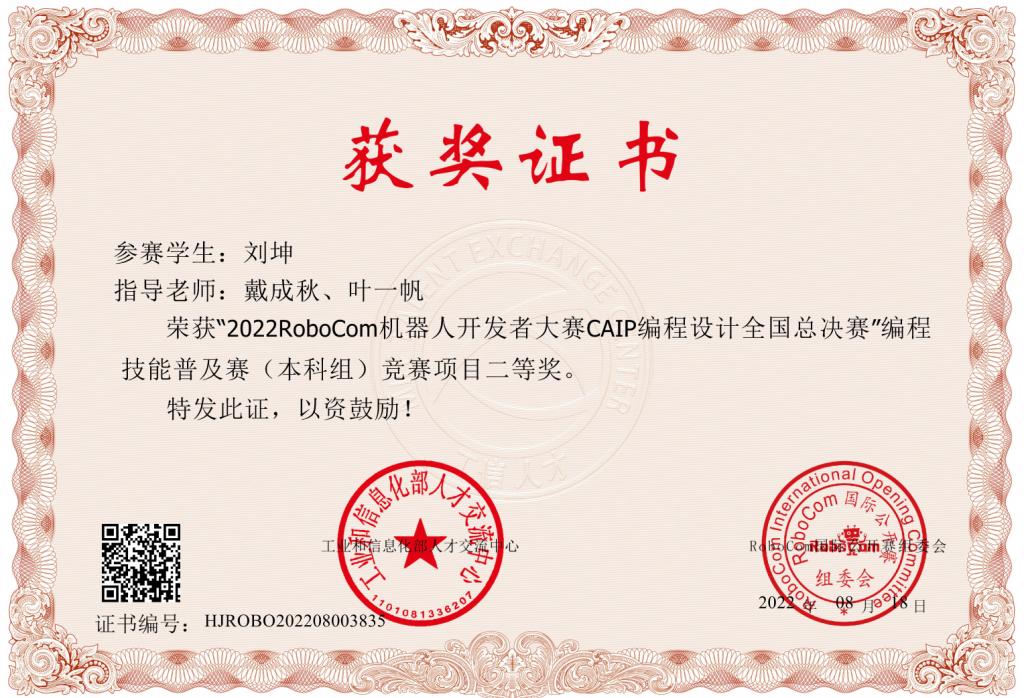 近日,由工业和信息化部人才交流中心、RoboCom国际公开赛组委会共同主办的“2022 RoboCom 机器人开发者大赛CAIP编程设计全国总决赛”(以下简称RoboCom-CAIP)圆满结束。经过全国24个省份160余所高校的选拔,本科组共有1126人进入全国总决赛,通过与众多高校选手的激烈角逐,best365中国官方网站计算机科学与工程学院ACM集训队取得了国家级二等奖 3 项、国家级三等奖3 项的好成绩,计算机科学与工程学院戴成秋、叶一帆荣获“优秀指导教师”荣誉称号。