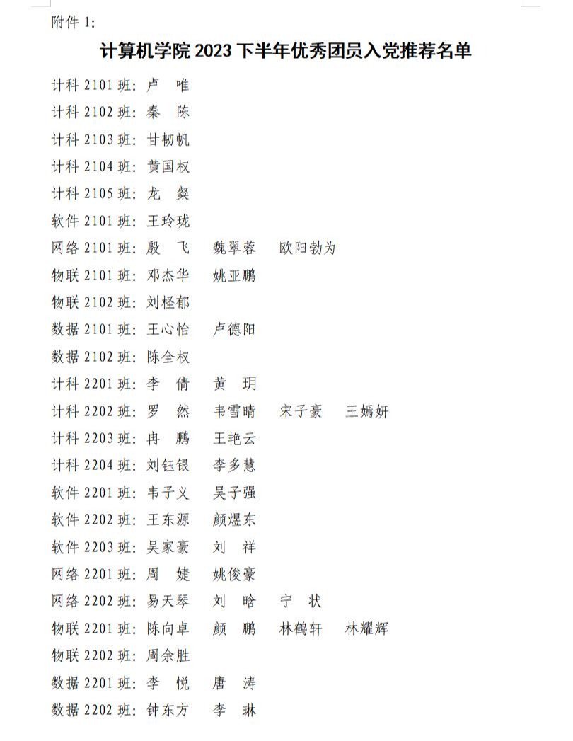 附件1:计算机学院2023下半年优秀团员入党推荐名单