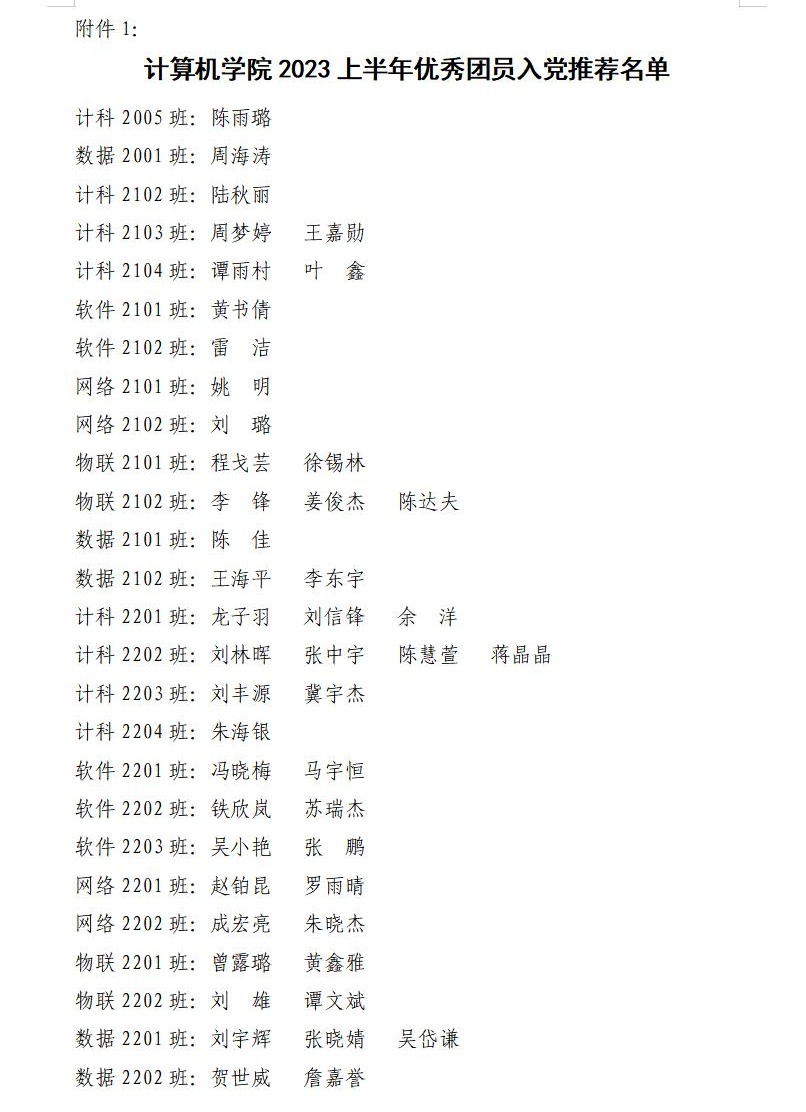 附件1:计算机学院2023下半年优秀团员入党推荐名单