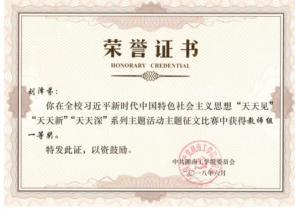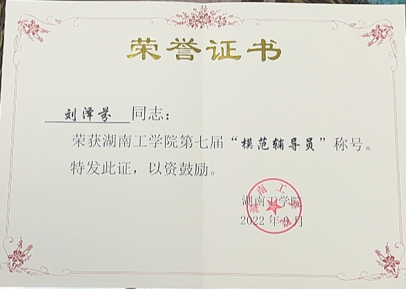 刘泽芬认真履行职责,努力完成工作任务。在学生思想理论教育和价值引领上,经常性开展主题教育、班会、党团活动等,在关键时间节点抓好学生思想政治教育工作。做到自身理论素质过硬,参与思想道德与法治、形势与政策等课程教学,曾获评best365中国官方网站习近平新时代中国特色社会主义思想“天天见”“天天新”“天天深”系列活动主题征文比赛教师组一等奖。