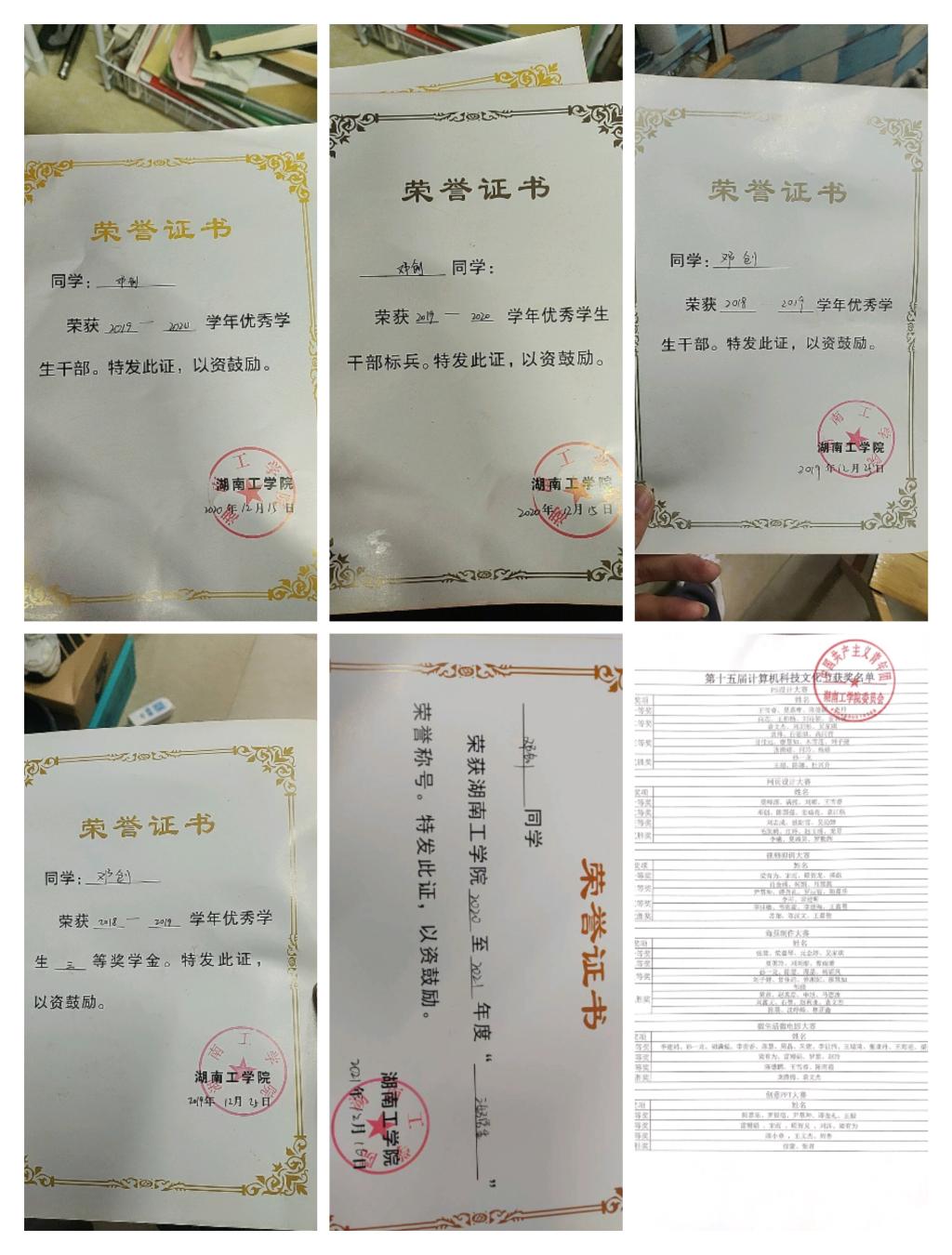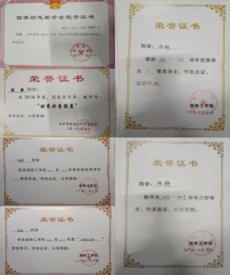 在校期间荣获国家励志奖学金3次、校级一等奖学金2次、校二等奖学金1次、校三好学生3次、校三好学生标兵1次、校优秀共青团员1次,校优秀学生干部1次;多次参加学校组织的公益活动,在衡阳市首届国际马拉松比赛中获“优秀志愿者”。