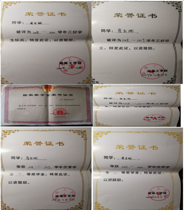 在校期间获得国家励志奖学金、校级优秀学生二等奖学金三次、校级三好学生、优秀共青团员、优秀学员、一校一书征文三等奖、优秀工作者、科技文化节二等奖、衡阳市优秀志愿者等荣誉。