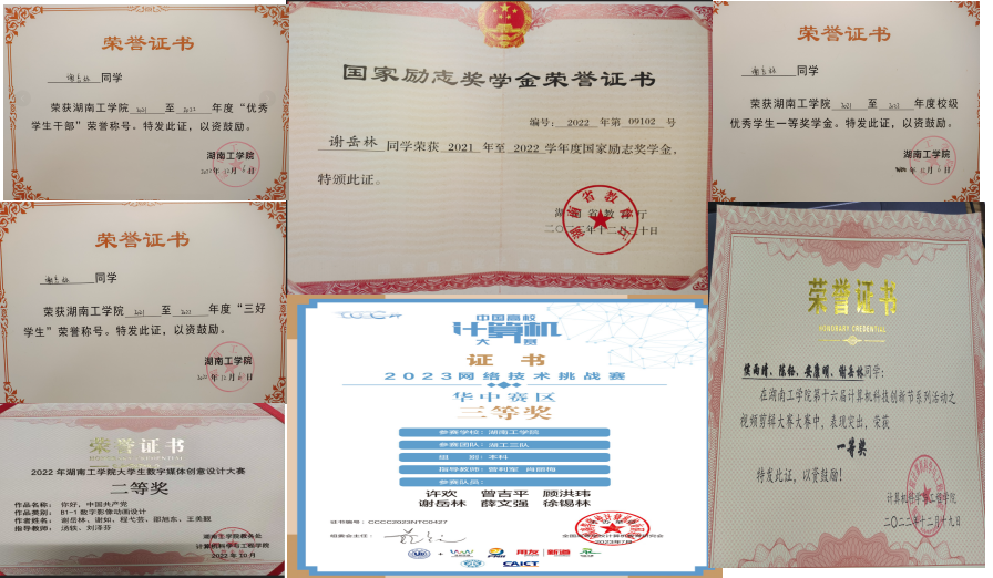 在校期间多次获得省、校级荣誉,荣获国家奖学金1次、国家励志奖学金1次、校级一等奖学金2次、校级“三好学生”称号2次、校级优秀共青团员1次,优秀共青团干部1次。曾参加湖南省大学生数字媒体创意设计大赛省级二等奖与第十六届中国大学生计算机设计大赛获中南赛区二等奖,在校期间积极参与志愿活动,被评为县级“优秀志愿者”。