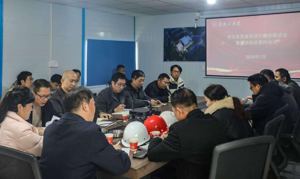 2026年1月16日上午,学生食堂建设项目廉洁谈话会暨《廉政承诺书》签订仪式在项目部会议室举行。校党委委员、副校长黄红卫,校党委委员、纪委书记王艳琼出席会议。