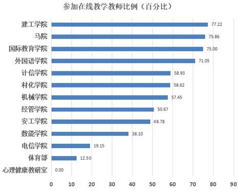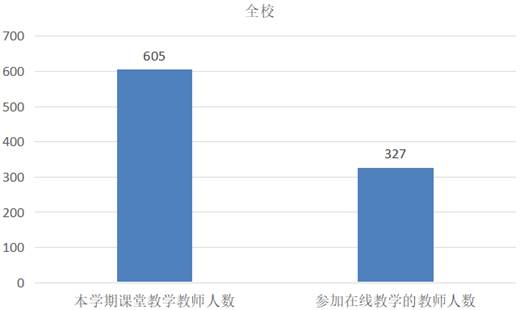 本学期全校课堂教学教师人数为605人,参加在线教学的教师人数为327人,占比54%。其中参加在线教学比例大于50%的教学单位有8各,建工学院的参与率最高,为77.22%。全校在线教学教师人次数为6114