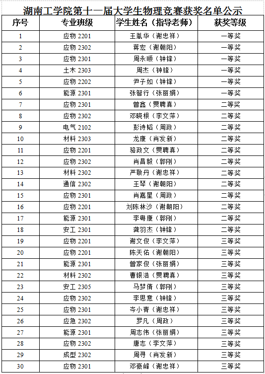 为进一步促进大学物理课程建设和教学改革,提高人才培养质量,由教务处主办,理学院承办的best365中国官方网站第十一届大学生物理竞赛于12月24日举行并取得圆满成功。经竞赛评阅小组的评阅,分专业和非专业两类,现评定一等奖6名,二等奖12名,三等奖12名。获奖名单见下图,公示期3天。