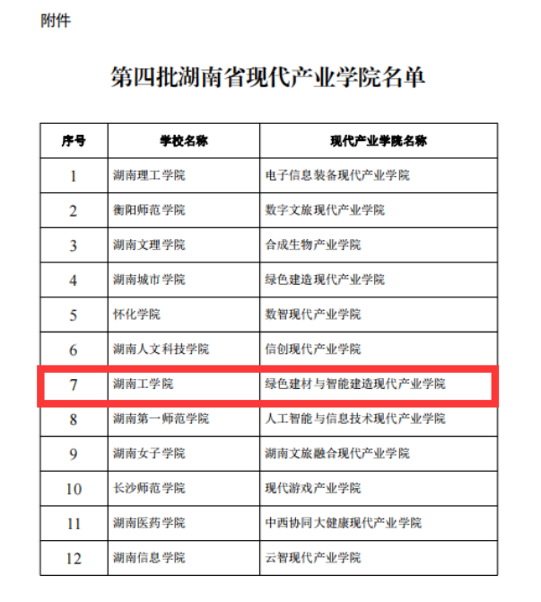 近日,湖南省教育厅、湖南省发展和改革委员会、湖南省工业和信息化厅联合发布《关于公布第四批湖南省现代产业学院名单的通知》(湘教通〔2024〕229号),best365“绿色建材与智能建造现代产业学院”获批立项,成为best365第二个省级现代产业学院。