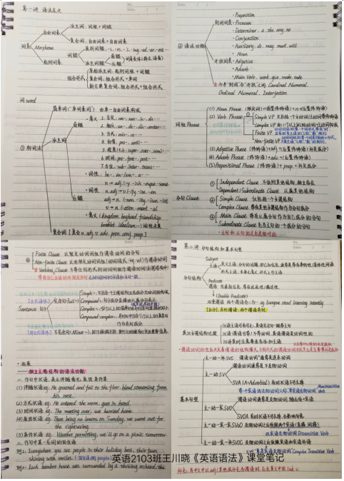 为了突出重难点,使笔记更加直观,学生们选用不同颜色进行标记:紫色→重要概念;粉色→重要内容;黄色→重要结论等等。期末复习时,多色笔记法对复习功课起到了很大的帮助。