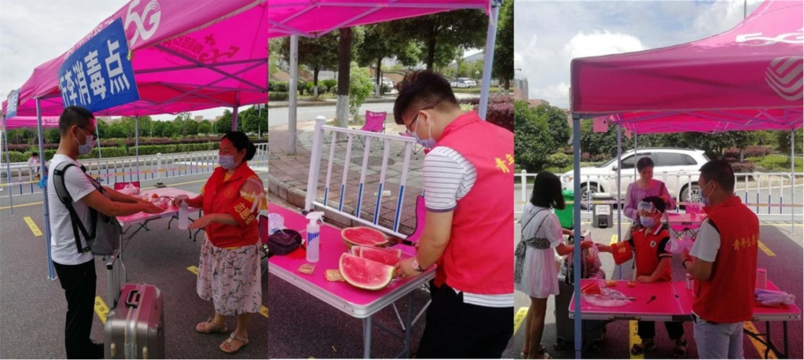还在产假期间的支部党员李庆芬同志在温度最高的时段来到了活动现场,细致地为学生进行行李消杀,她说道“一直想为疫情防控做点什么,今天是学校毕业生返校的最后一天,所以我来了”。支部有授课任务未能参加活动的同志,在课间带着西瓜来到了现场,一块块冰西瓜下肚,志愿者们夏日的暑热一扫而光。支部书记吴远志同志七岁的儿子在课后也来到了现场,他带上口罩和护目镜,有模有样的为返校学生进行体温监测、行李消杀,俨然一个“小小志愿者”。