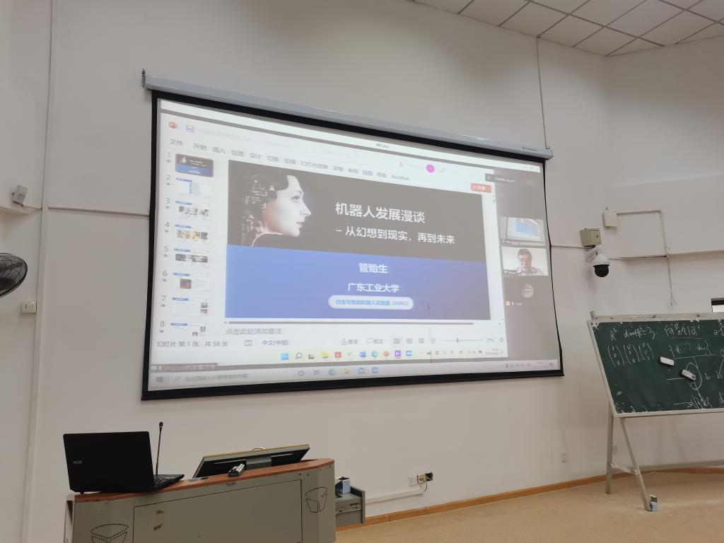 10月26日上午,广东工业大学管贻生教授以“机器人发展漫谈---从幻想到现实,再到未来”为题给机器人工程专业学生和老师授课。他从各国机器人的发展简史开篇,阐述了现代机器人的概念,对机器人的分类进行了讲解,重点对机器人的示例和应用进行了介绍,并对机器人研究热点和发展趋势进行了分析。他指出我国是全球最大的机器人消费国,但机器人产业存在起步稍晚、发展滞后、跟踪为主、原创不足等问题,同时也呈现出后发优势、应用爆发、加速发展、局部并跑等特点,并鼓励青年学子要打牢专业基础知识、培养创新能力,立志为我国机器人产业领跑世界贡献力量。