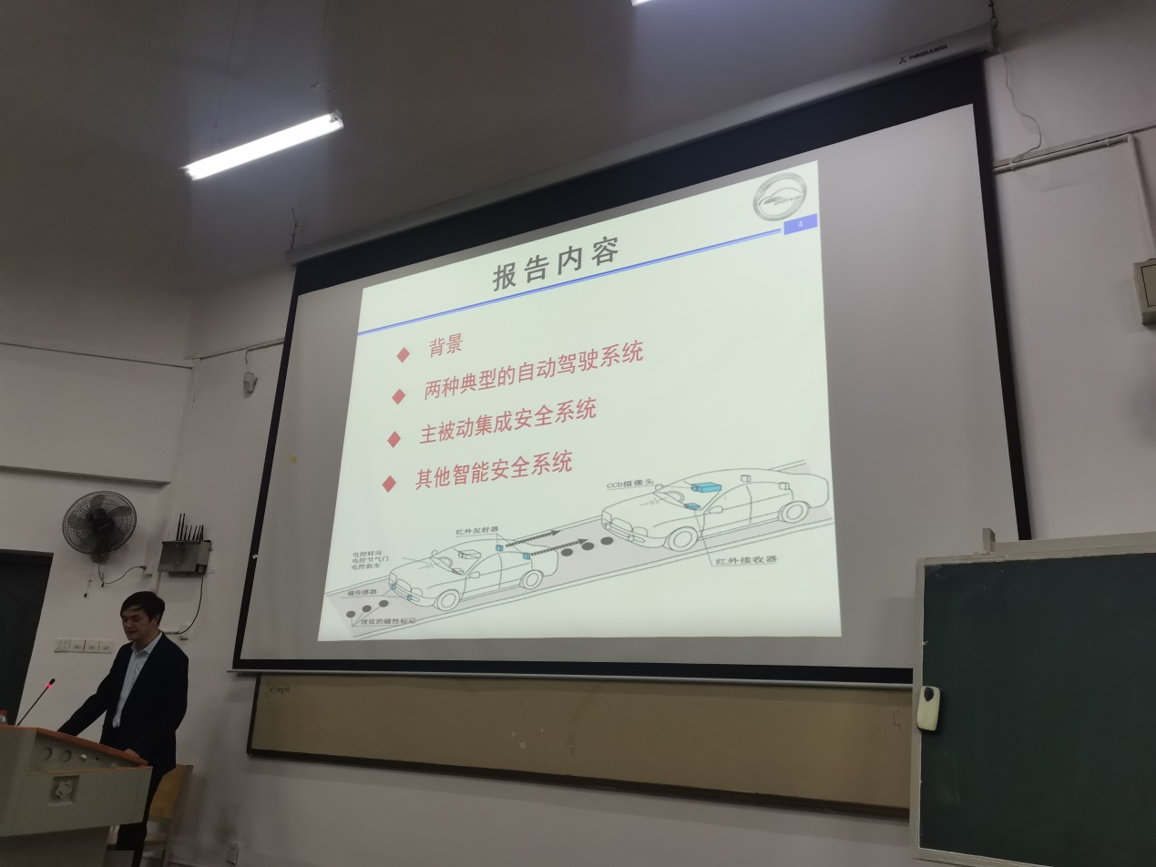 10月28日下午,湖南大学曹立波教授以“汽车的智能安全技术”为题为智能车辆工程专业学生和老师授课。他从汽车安全的重要性背景出发,详细介绍了汽车智能化和自动驾驶技术的发展现状,并着重讲解了基于深度学习的车辆主被动安全集成系统研发历程。接着以车内滞留儿童检测系统、基于全景与人机交互的自动泊车系统和路面垃圾评测系统为例介绍了智能安全系统的研究意义与应用前景。他指出我国是全球最大的智能汽车生产与消费国,鼓励现场教师和青年学子要深入学习相关理论知识,培养敢为人先的创新精神和吃苦耐劳的奋斗精神,为我国的智能汽车的发展贡献自己的一份力量。