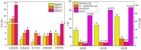 在学生成长方面,学院涌现出以中国大学生自强之星吴小刚和王希骏为代表的有理想、敢担当、能吃苦、肯奋斗的新时代青年大学生;在各类学科竞赛中,我院学子近5年获国家级奖励75项、省级获奖32项,在全国大学生先进成图技术与产品信息建模大赛中稳居第一方阵;学生就业率和考研率持续攀升,2023届毕业生中93名学生被国内外高校拟录取为硕士研究生,占毕业生总人数的11.9%,22名学生被 “双一流”高校拟录取,展现出我院学子努力拼搏、自律自强、奋发向上的精神风貌。