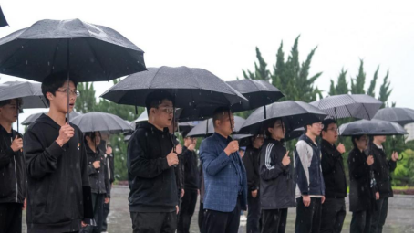在雨中,全体人员在庄严的烈士纪念碑前排列整齐,神情肃穆,眼神坚定,齐声高唱国歌。