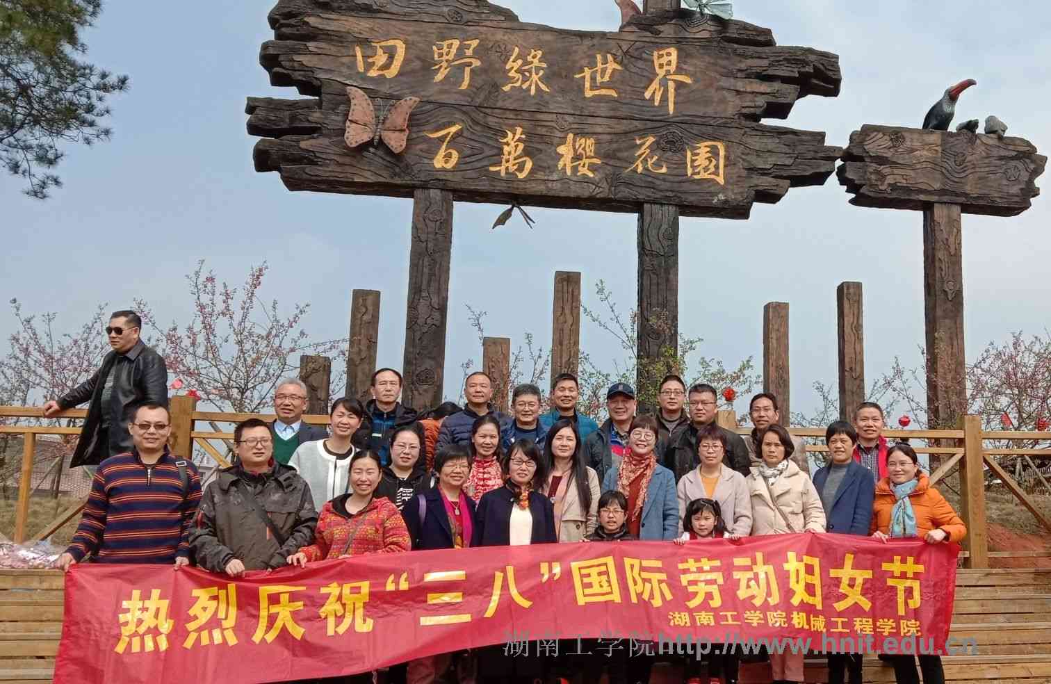 为庆祝第109个“三八”国际劳动妇女节,丰富女性教职工文化生活,3月10日,机械工程学院分工会到常宁社会主义新农村建设基地——百万樱花种植园举行户外实践活动。联系校领导罗建华向女教职工表达了祝福,并出席了本次活动。