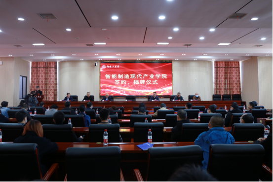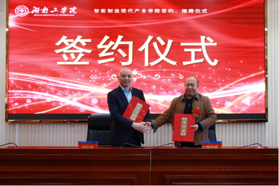 仪式现场,刘升学代表学校分别与山河智能装备股份有限公司、湖南机油泵股份有限公司、湖南天雁机械有限责任公司、南岳电控(衡阳)工业技术股份有限公司签约,曹执令与吴文伟共同为“智能制造现代产业学院”揭牌。