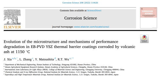 发表在《Corrosion Science》题为“Evolution of the microstructure and mechanisms of performance degradation in EB-PVD YSZ thermal barrier coatings corroded by volcanic ash at 1150°C”科研成果,采用原位高温XRD实时测量了火山灰腐蚀热障涂层材料过程中的相变和化学反应,结合涂层微观结构和腐蚀导致的热-力学性能演化关系,揭示了火山灰对热障涂层的腐蚀机理,相关研究成果对缓解目前航空发动机安全应用所面临的熔融物腐蚀威胁有一定的指导意义。该成果第一作者为智能制造与机械工程学院夏杰博士,于2022年8月进入学校工作,主要从事热障涂层制备与性能表征、涂层抗高温腐蚀、工件表面磨损修复等研究工作;入职以来主持企业横向科研项目1项,建设校企合作课程项目1项,发表学术论文2篇。