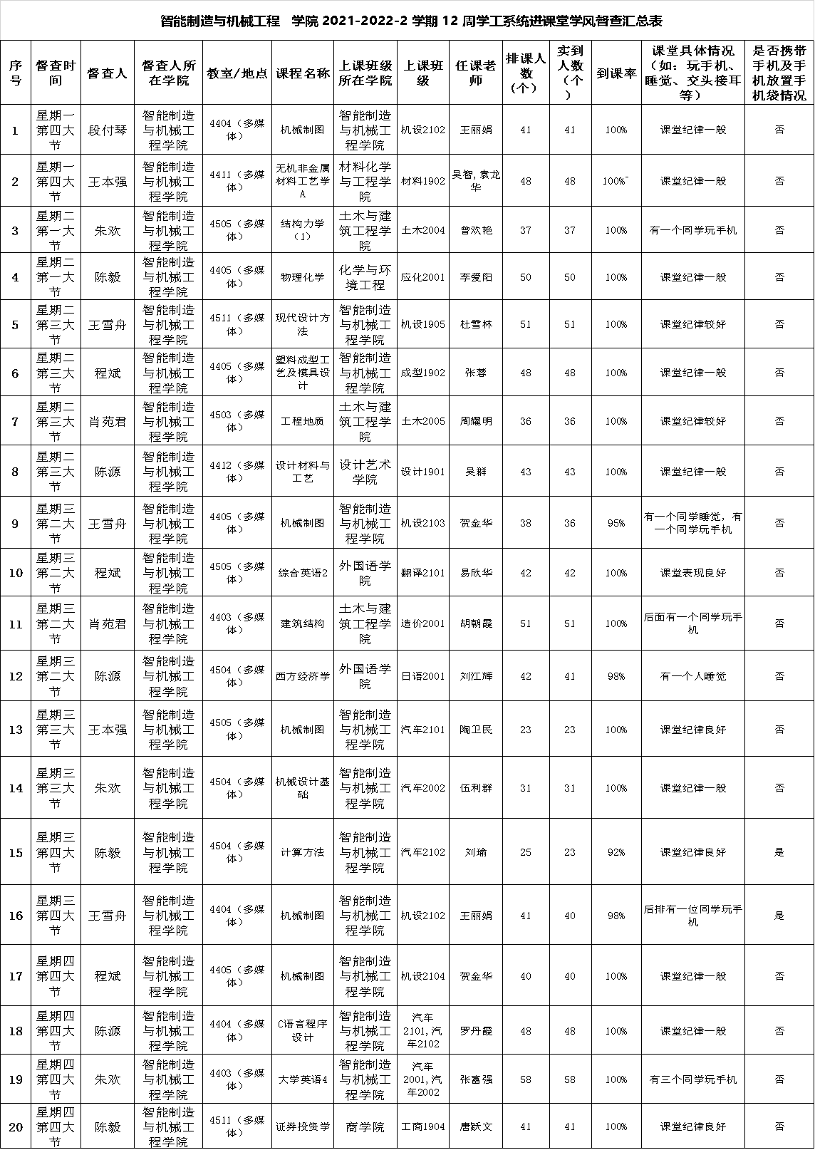 智能制造与机械工程学院2021-2022-2学期第12周学工系统进课堂学风督导情况