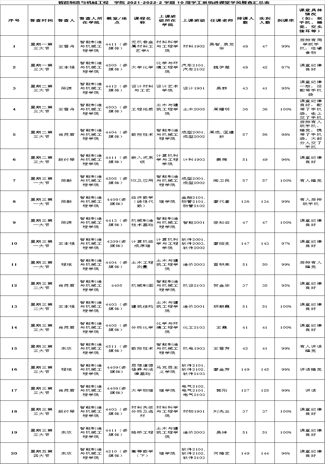 智能制造与机械工程学院2021-2022-2学期第10周学工系统进课堂学风督导情况
