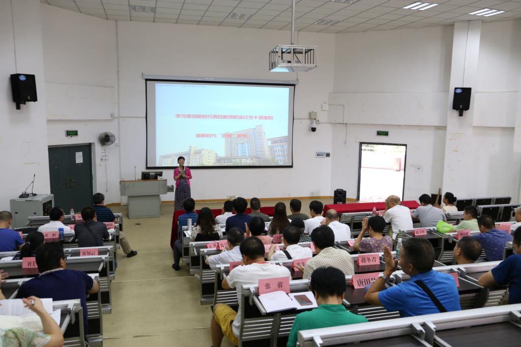 院党委书记王丽娟结合师德师风的实际案例,带领大家学习了《贯彻新时代高校教师职业行为十项准则》,做新时代“四有”教师。她强调,师者,人之模范也,无德者无以为师。做好老师,要有理想信念,要有道德情操,要有扎实学识,要有仁爱之心。她要求大家从提高思想认识、加强制度建设和教师使命感三方面入手,知行合一,入心践行,切实执行,有效运转,做“四有”好老师。