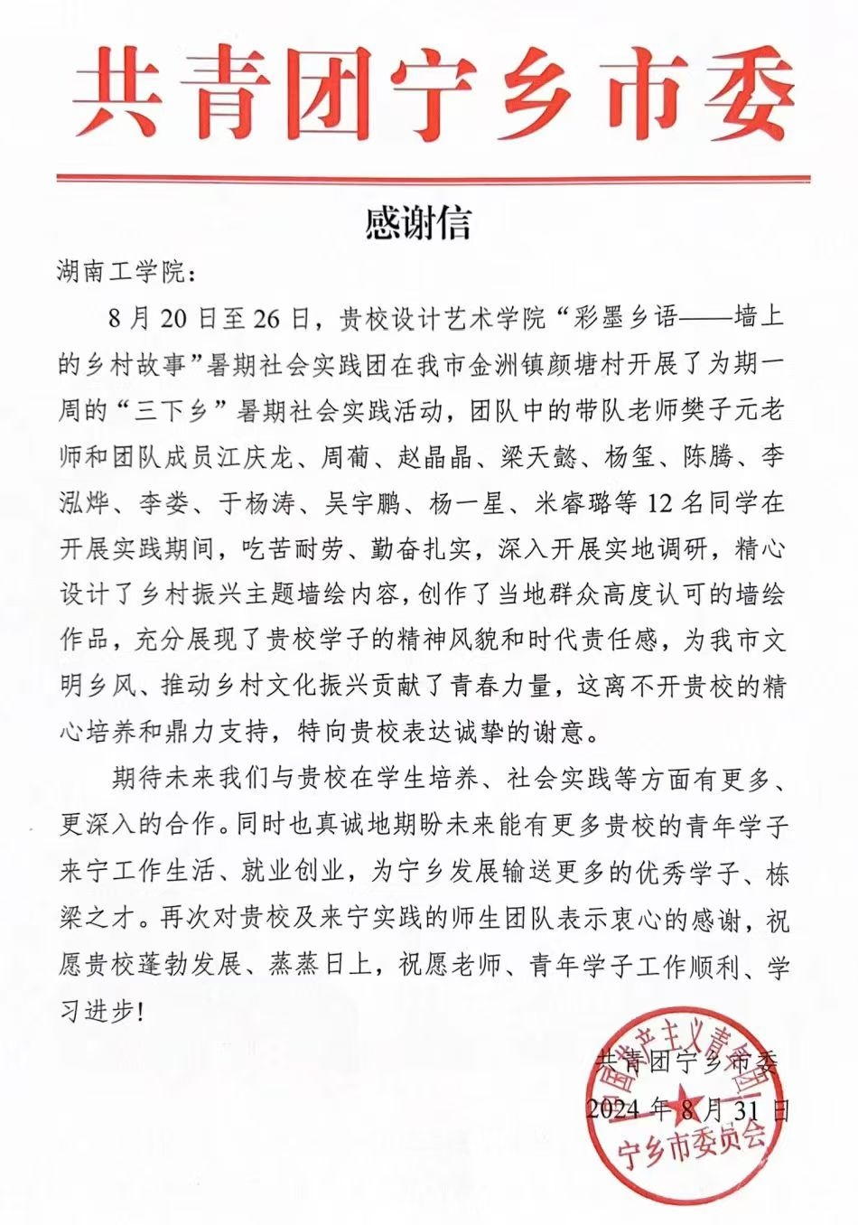 近日,best365中国官方网站设计艺术学院收到一封来自共青团宁乡市委的表扬信,信中,共青团宁乡市委对我院“彩墨乡语--墙上的乡村故事”暑期社会实践团的“三下乡”活动表示肯定,对我院师生的吃苦耐劳的优秀品质和热忱的服务意识表示高度赞扬。