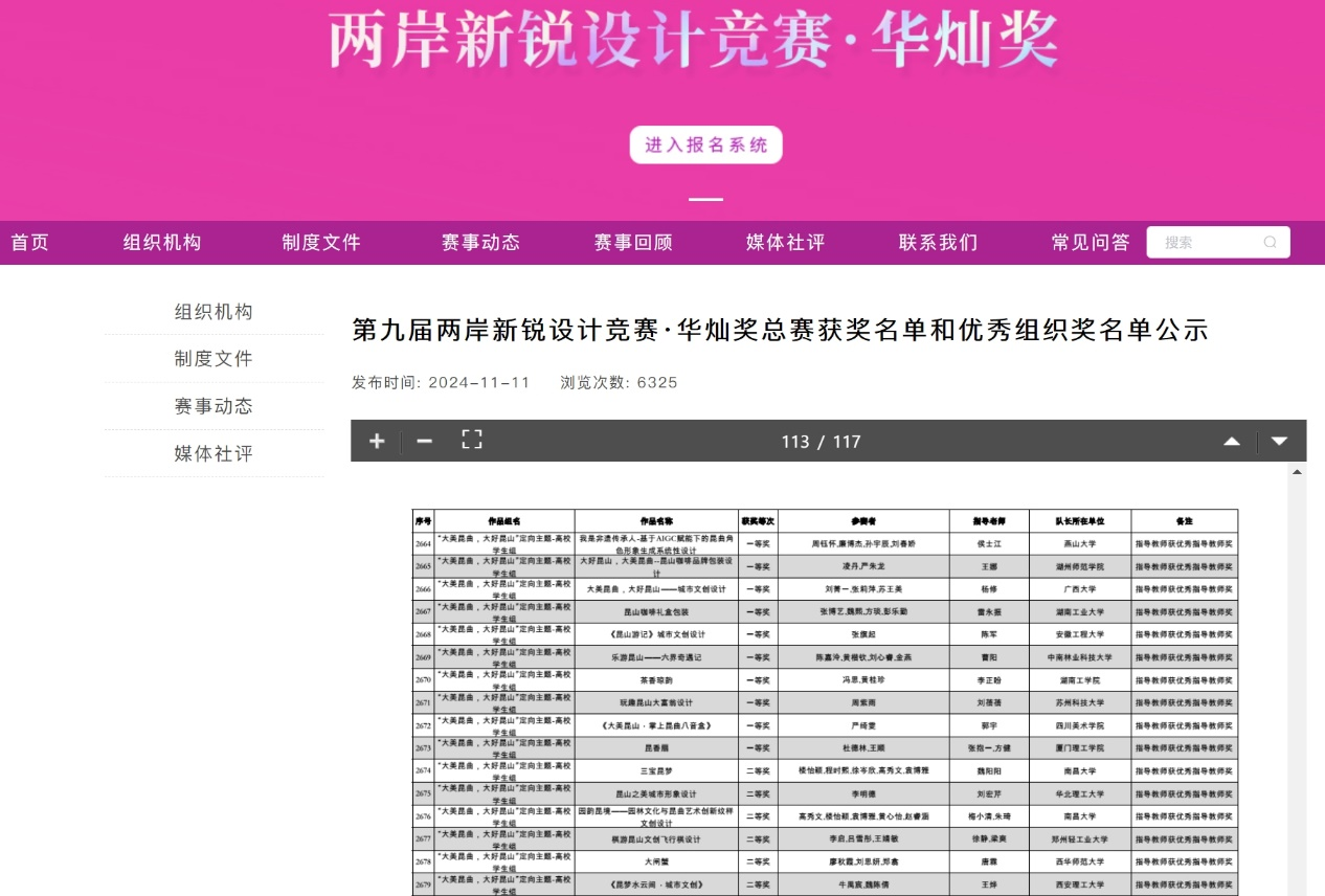 两岸新锐设计竞赛·华灿奖(以下简称“华灿奖”)是“全国普通高校学科竞赛排行榜”上的重要赛事,由中国高等教育学会、中华中山文化交流协会及北京歌华传媒集团有限责任公司主办。旨在进一步探索海峡两岸融合发展新路,推动海峡两岸暨香港、澳门广大青年的交流互动,深化文化交流,增强文化认同,促成两岸文化创意及相关产业的合作共赢,提升两岸艺术设计类大学生人才培养质量。