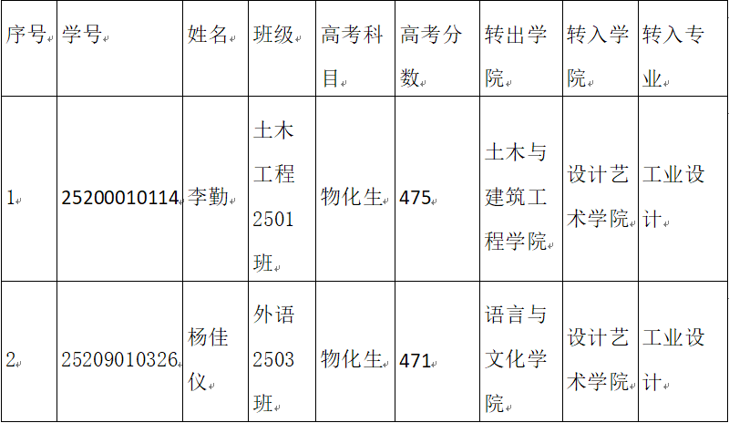 按照《best365中国官方网站本科学生学籍管理规定》(湖工政发〔2020〕26号文件、《关于做好2025级学生转专业工作的指导性意见》和《设计艺术学院2025级学生转专业工作方案》的要求,经学院党政联席会议讨论决定,同意李勤、杨佳仪同学拟转入设计艺术学院相关专业。现予以公示。公示期2026年1月28日-2026年1月30日,若有异议,请实名向学院反映(6213办公室:孟老师)。