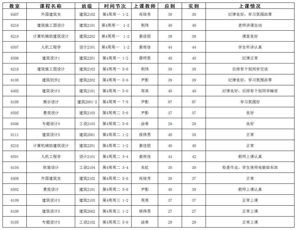 第4-5周我院各项教学活动正常开展。学院继续保持日常教学检查力度,对我院所有教师和学生上课进行例行检查。