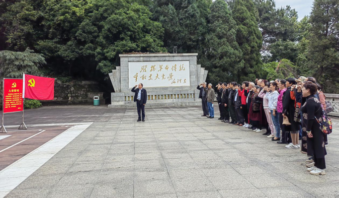 离退休老同志首先来到毛泽建烈士陵园,深入了解毛泽建烈士的生平事迹,感受革命先烈在战争年代誓死为党和人民牺牲一切的赤胆忠诚。在庄严肃穆的毛泽建烈士纪念碑前,张忠贤带领全体党员向烈士鞠躬默哀致敬,以表达对革命先烈的缅怀和哀思。随后,张忠贤领誓,党员面对党旗重温了入党誓词。